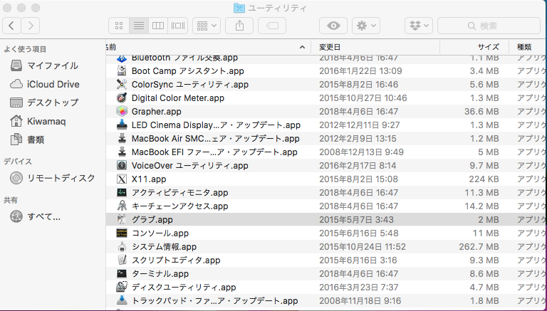 グラブはユーティリティーフォルダに入っていて、コマンド+シフト+U(⌘+shift+u)を押すと開いてくれる。
