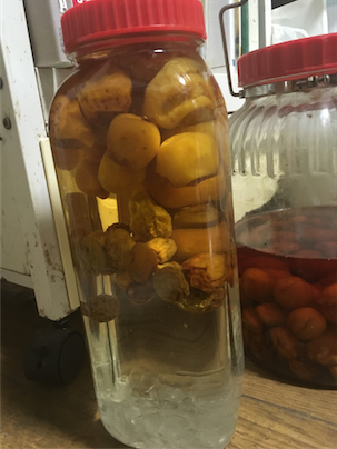 写真の解説ですが、瓶の上にはお酒を吸ってパンパンになっている梅があります。